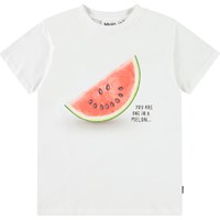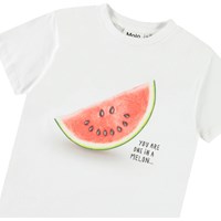 Wit t-shirt van zacht biologisch katoen met ribboord rond de hals. Het t-shirt heeft een ruimvallende pasvorm met een stuk watermeloenprint en de tekst 'One in a Melon'.