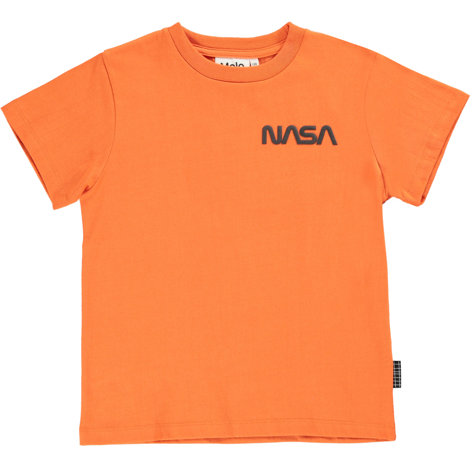 Rame is een oranje unisex t-shirt met op de voorkant een print van Nasa. Het t-shirt heeft een ronde hals.