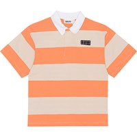 Oranje en zandkleurige polo van biologisch katoen. De polo heeft een witte kraag, een logo op de voorkant en een ruimvallende pasvorm. De polo heeft een knoopsluiting met drie verborgen knopen, zodat het gemakkelijk is aan te trekken en het comfortabel is.