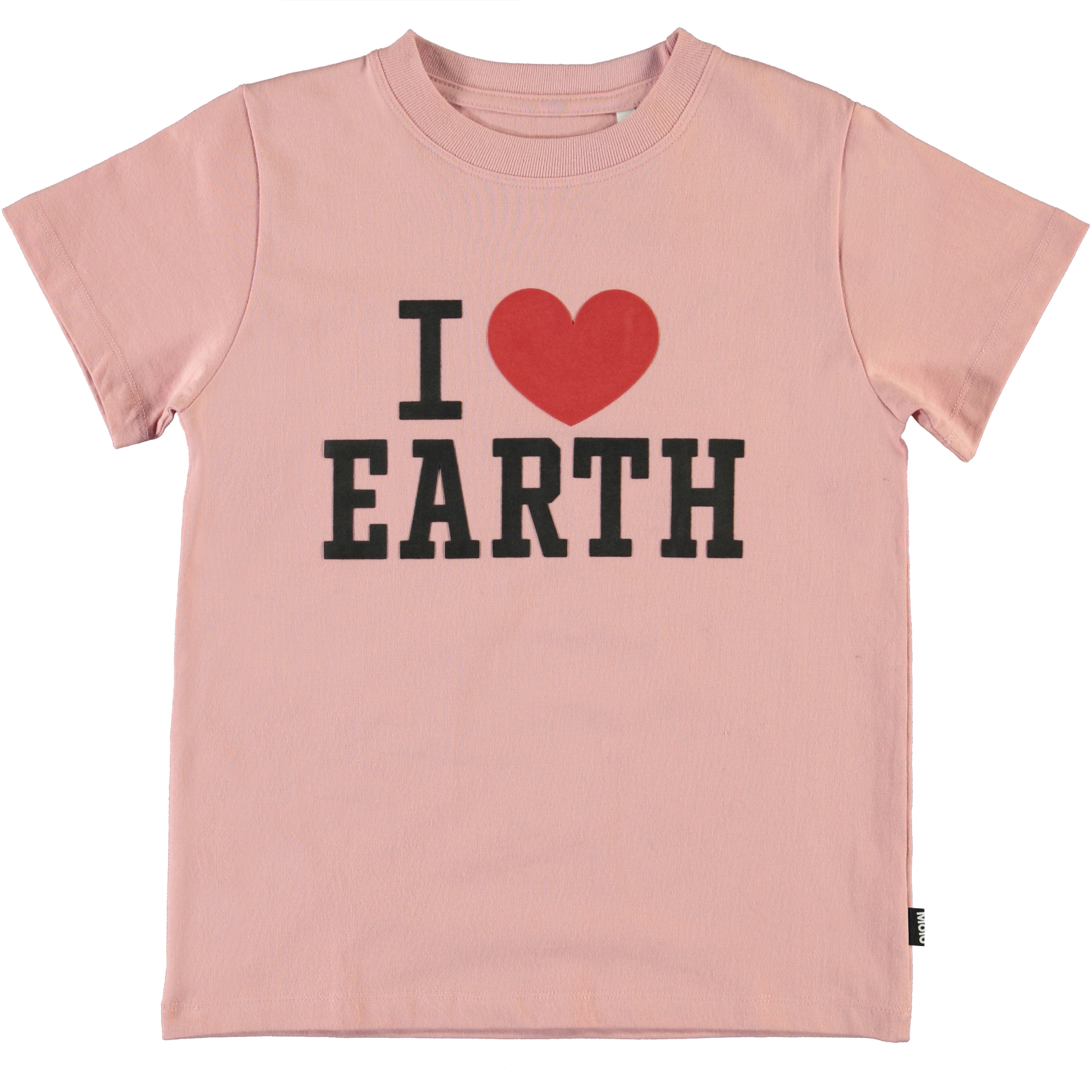 Reeve is een roze t-shirt met op de voorkant “I love Earth”.