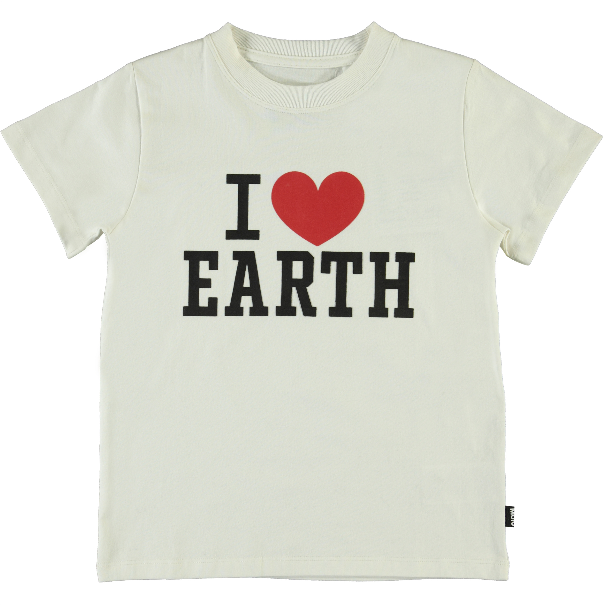 Reeve is een wit t-shirt met op de voorkant “I love Earth”.
