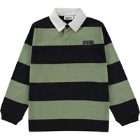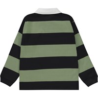 Brede zwart met groen gestreept rugbyshirt. Het is van 100% katoen, heeft lange mouwen met een ribboord een geweven, witte kraag en een logo op de voorkant. Het heeft een normale pasvorm.