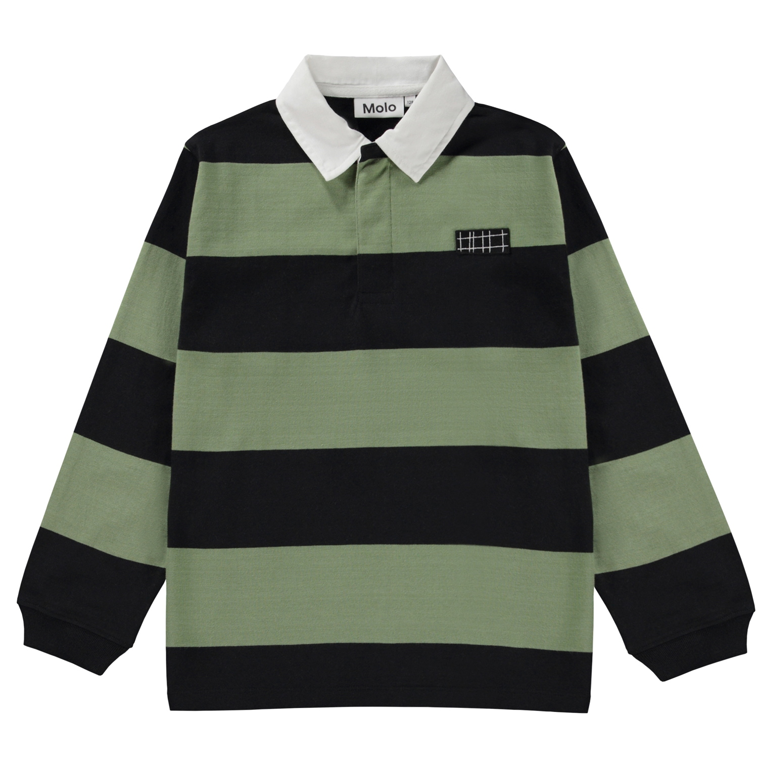 Brede zwart met groen gestreept rugbyshirt. Het is van 100% katoen, heeft lange mouwen met een ribboord een geweven, witte kraag en een logo op de voorkant. Het heeft een normale pasvorm.