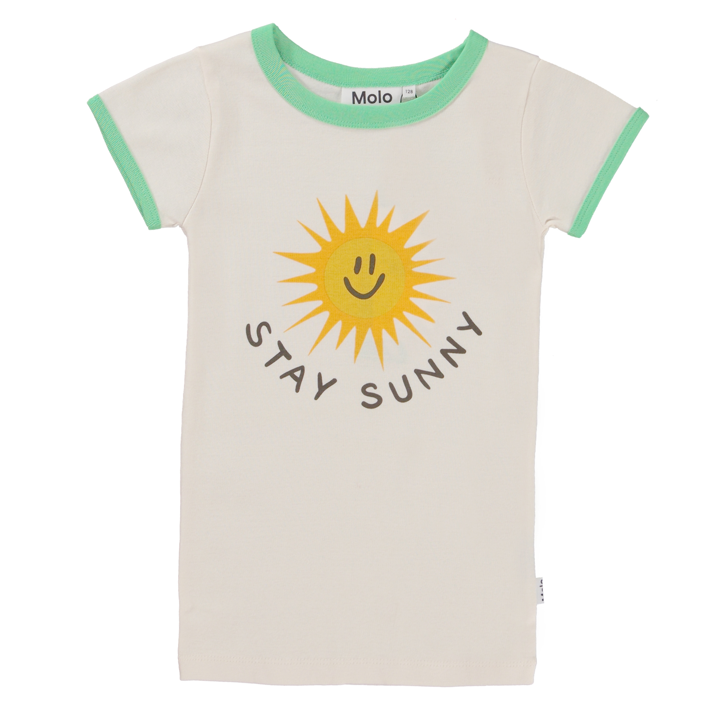 Rhiannon is een lichtgekleurd ringer t-shirt met een print van een vrolijke zon en de tekst 'Stay sunny'. Het t-shirt heeft een groene boord rond de hals en mouwen.