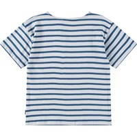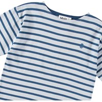 Blauw en lichtblauwe gestreepte t-shirt van zacht biologisch katoen met korte mouwen en biaisband aan de binnenkant. Het t-shirt heeft ruimvallende pasvorm en een klein geborduurde peace sign op de borst.