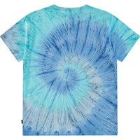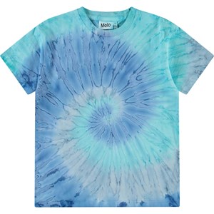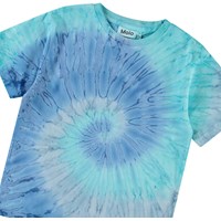 Ruimvallende t-shirt in blauwe tie-dye kleuren van zacht biologisch katoen met korte mouwen en ribboord rond de hals.