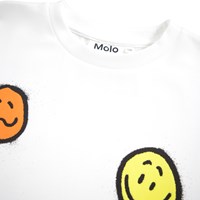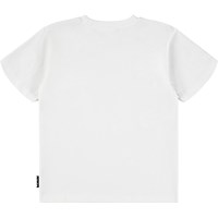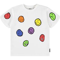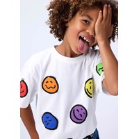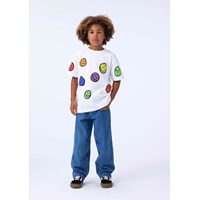 Wit t-shirt gemaakt van zacht biologisch katoen met een ribboord rond de hals. Het t-shirt heeft een ruimvallende pasvorm en een print van kleurrijke gezichten met verschillende uitdrukkingen.