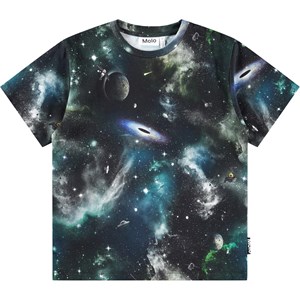 Zwart t-shirt gemaakt van zacht biologisch katoen met een ribboord rond de hals. Het t-shirt heeft een ruimvallende pasvorm en een print van de nachtelijke hemel, het noorderlicht, planeten en satellieten in prachtige kleuren.
