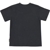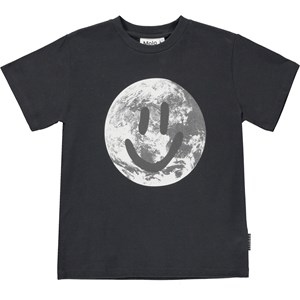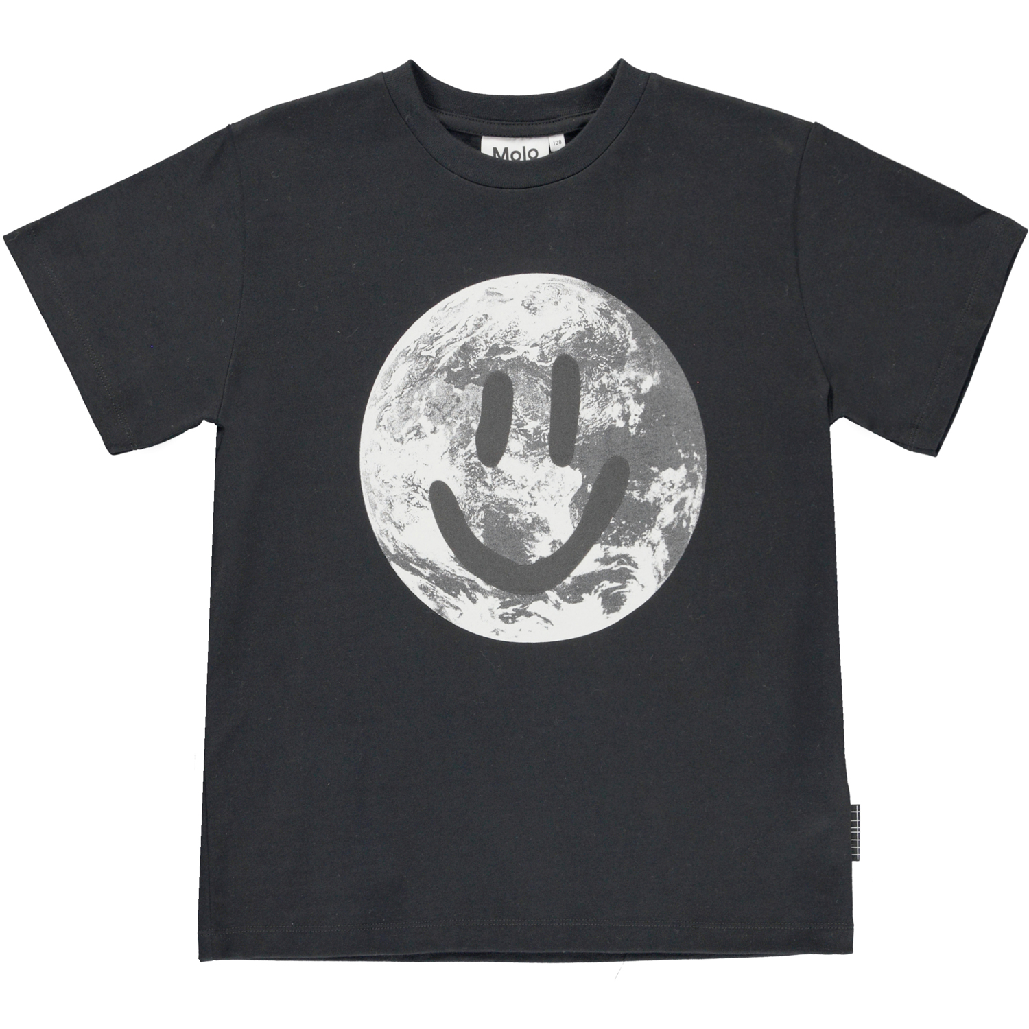 Riley is een zwarte unisex t-shirt met op de voorkant een print van de Aarde met een smiley. Het t-shirt heeft een ronde hals.