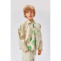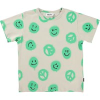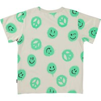 Riley is een beige, ruimvallende, unisex t-shirt met een aansluitende ronde hals en een groene print van een peace teken en smileys. Het t-shirt heeft korte mouwen.