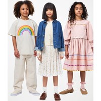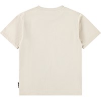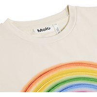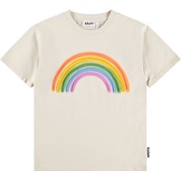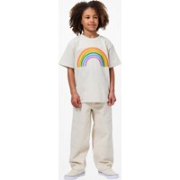 Beige T-shirt gemaakt van zachte biologische katoen met een ribboord rond de hals. Het T-shirt heeft een ruimvallende pasvorm met een kleurrijke geborduurde regenboog.