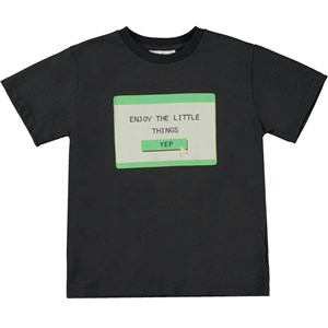 Zwart t-shirt met op de voorkant een retro computerprint. De print is een groene print van een startvenster op de computer die vraagt om op "Ja" te klikken om van de kleine dingen te genieten. Dit t-shirt is van 100% biologisch katoen en heeft een ronde hals met ribboord. Het heeft een ruimvallende pasvorm.
