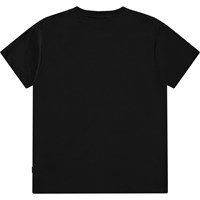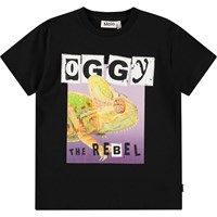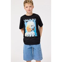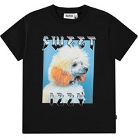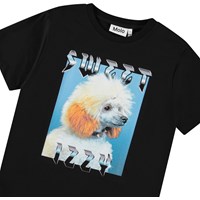 Zwart t-shirt van zacht biologisch katoen met korte mouwen en ribboord rond de hals. Het t-shirt heeft een ruimvallende pasvorm met op de voorkant een print van een stoere poedel en de tekst 'Sweet Izzy'.