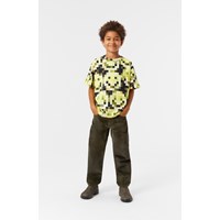 Geel en zwart t-shirt gemaakt van biologisch katoen. Het t-shirt heeft een ronde hals en geribbelde zoom. Het heeft een ruimvallende pasvorm en een all-over print van smileys, die alleen te zien zijn als ingezoomde pixels.