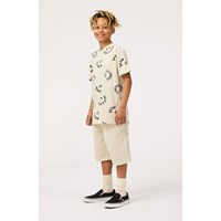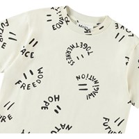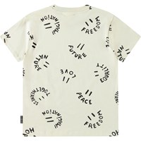 Gebroken wit t-shirt van zacht biologisch katoen met korte mouwen en ribboord rond de hals. Het t-shirt heeft een ruimvallende pasvorm en een all over print van smiley's met verschillende woorden als mond.