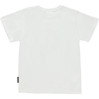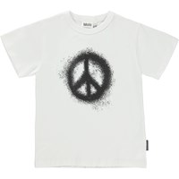 Riley is een witte, ruimvallende, unisex t-shirt met een aansluitende ronde hals en een print van een vredesteken. Het t-shirt heeft korte mouwen.
