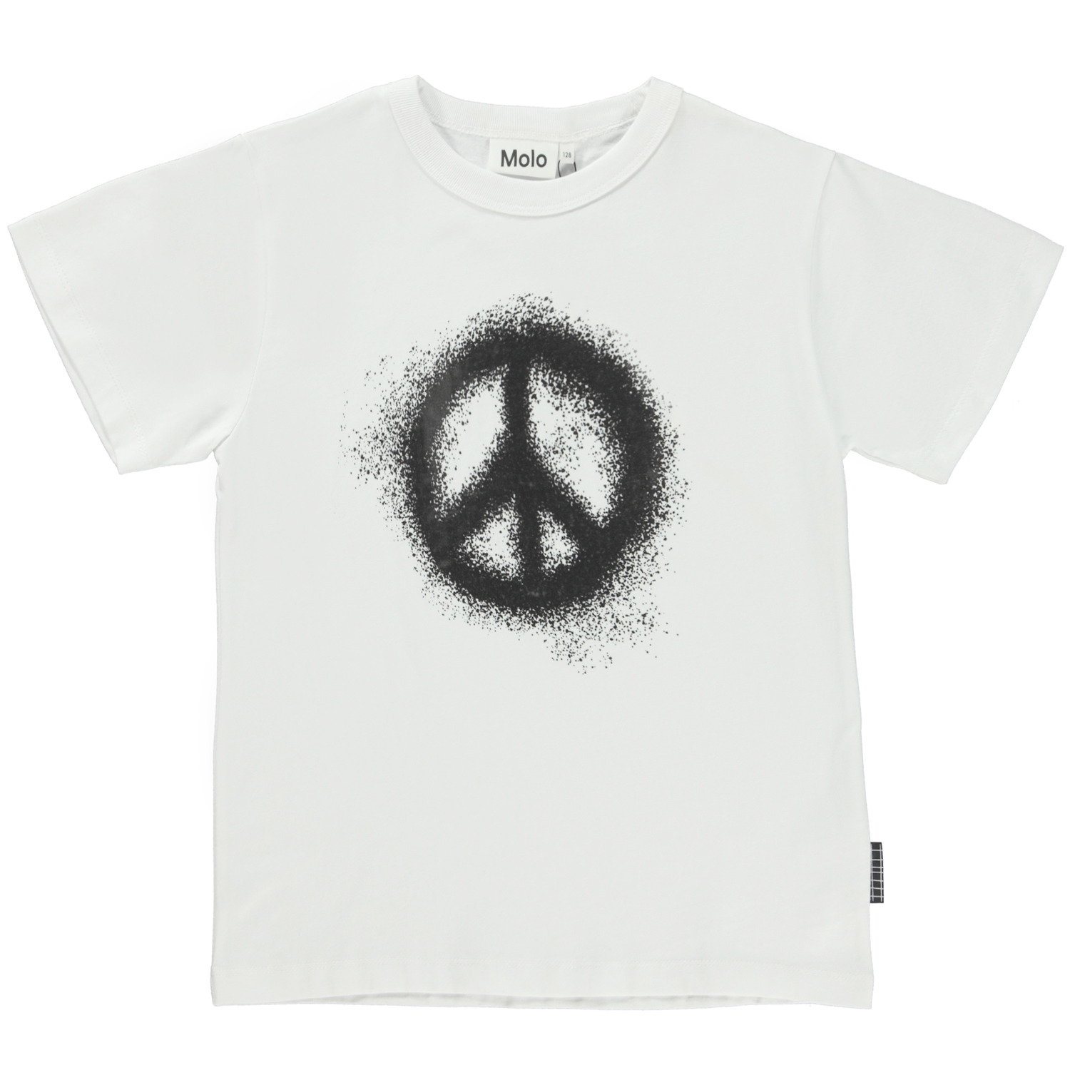 Riley is een witte, ruimvallende, unisex t-shirt met een aansluitende ronde hals en een print van een vredesteken. Het t-shirt heeft korte mouwen.