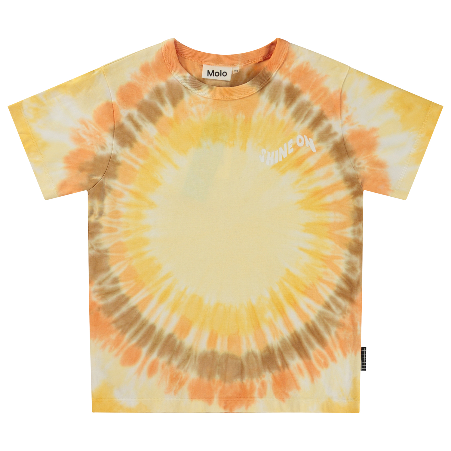 Geel t-shirt met op de voorkant een print. Het is een tie-dye print in de kleuren geel en oranje die schitteren als de zonnestralen. Het t-shirt heeft ook een print op de voorkant met de boodschap "Shine On". Dit t-shirt is van 100% biologisch katoen en heeft een ronde hals met ribboord. Het heeft een ruimvallende pasvorm. De tie-dye print van Molo is uniek en met de hand gemaakt, wat betekent dat het van stijl tot stijl kan verschillen.