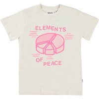 Road is een gebroken wit t-shirt met een roze print van een taartdiagram die laat zien wat er nodig is om vrede te creëren. Op het t-shirt staat ook de tekst 'Element of peace'.