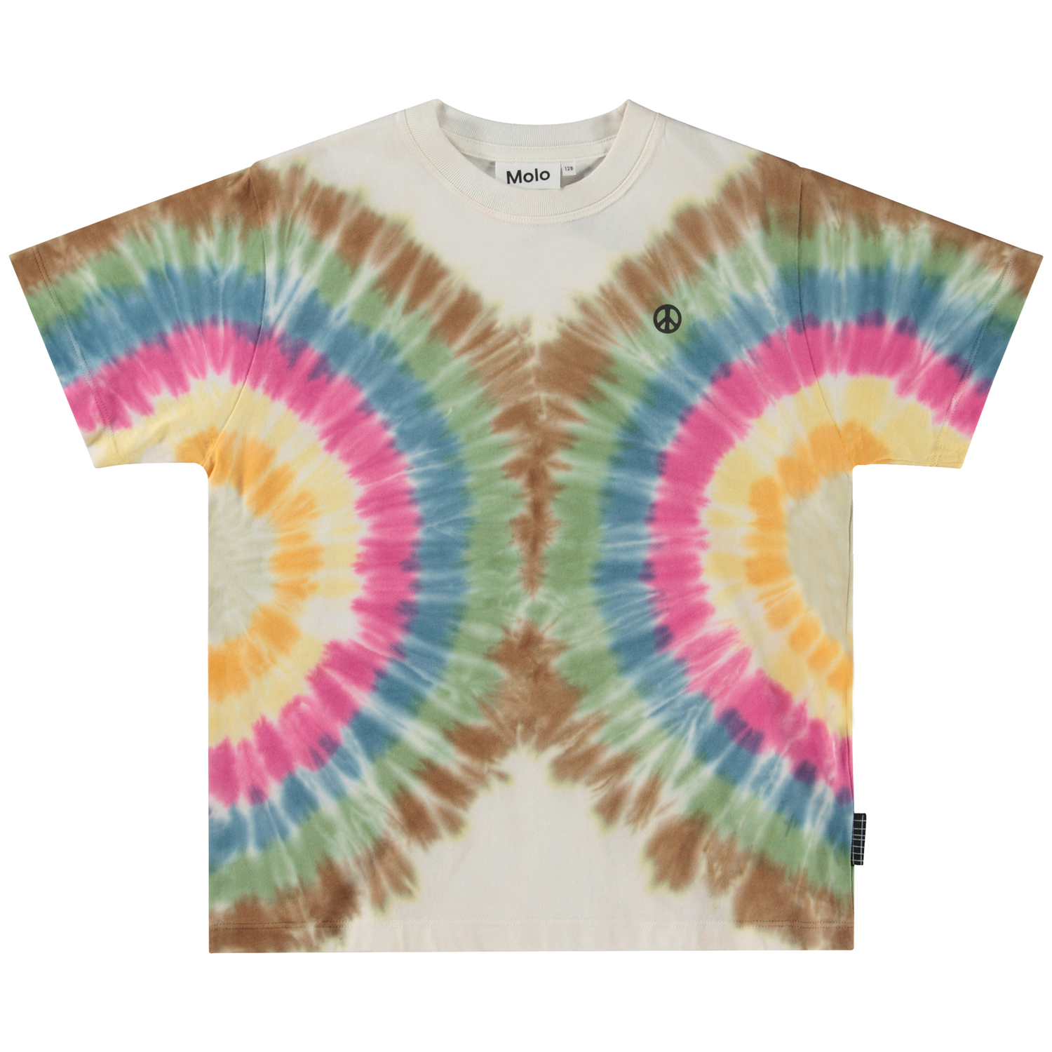 Veelkleurig t-shirt met tie-dye print. De print is op de voor- en achterkant en het tie-dye-patroon schijnt vanuit het midden naar de zijkanten. Dit t-shirt is van 100% biologisch katoen en heeft een ronde hals met ribboord. Het heeft een oversized pasvorm. De tie-dye print van Molo is uniek en met de hand gemaakt, wat betekent dat het van stijl tot stijl kan verschillen.