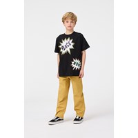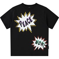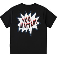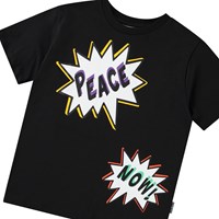 Black t-shirt in biologisch katoenen met korte mouwen en ribboord rond de hals. Het t-shirt heeft een ruimvallende pasvorm en tekstballonen op de voor- en achtekant met de tekst 'Peace' 'Now' en 'You Matter'.