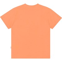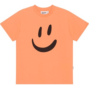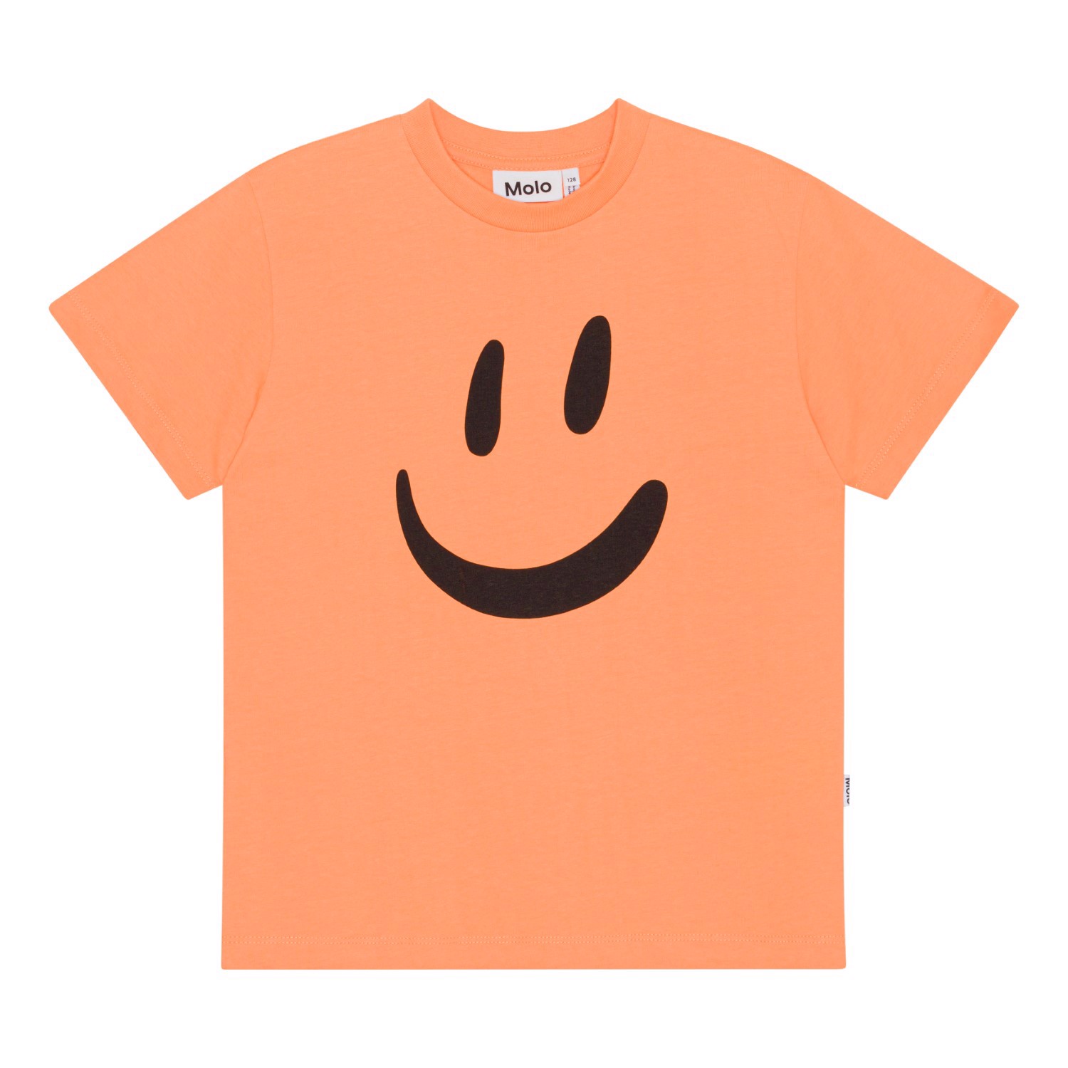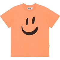 Oranje t-shirt van biologisch katoen met op de voorkant een print van een smiley. Het t-shirt heeft een ronde hals en een normale pasvorm.