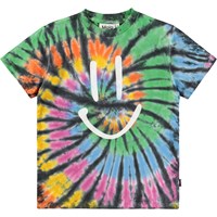 T-shirt met kleurrijke tie-dye gemaakt van zachte biologische katoen met een ribboord rond de hals. Het T-shirt heeft een ruimvallende pasvorm met een print van een lachend gezicht. Al onze tie-dye is handgemaakt, wat een uniek patroon creëert dat varieert van stijl tot stijl.