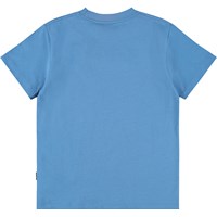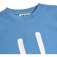 Blauw T-shirt gemaakt van zachte biologische katoen met een ribboord rond de hals. Het T-shirt heeft een ruimvallende pasvorm met een print van een lachend gezicht.