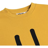 Geel T-shirt gemaakt van zachte biologische katoen met een ribboord rond de hals. Het T-shirt heeft een ruimvallende pasvorm met een print van een lachend gezicht.
