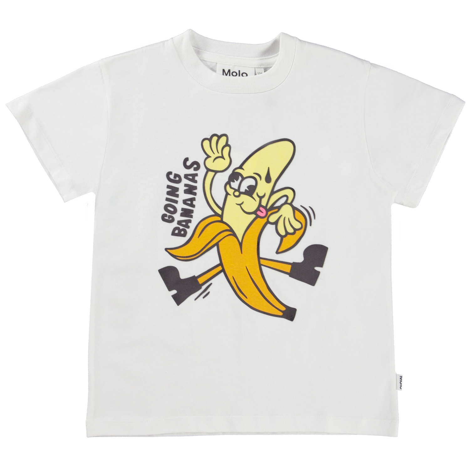 Roxo is een wit unisex t-shirt met een aansluitende ronde hals en een print van een komische banaan en de text ‘Going bananas’. Het t-shirt heeft korte mouwen.