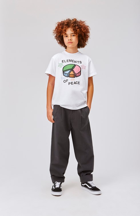 Roxo is een wit unisex t-shirt met een aansluitende ronde hals en de tekst 'Elements of peace' en een afdruk van een taartdiagram, in verschillende kleuren, die laat zien wat er nodig is om vrede te creëren. Het t-shirt heeft korte mouwen.