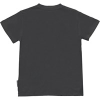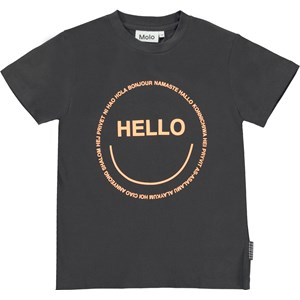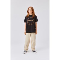 Roxo is een zwart t-shirt met een aansluitende ronde hals en een print van een smiley en de tekst 'hello'. Het t-shirt heeft korte mouwen.