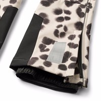 Wind- en waterafstotende softshell broek gemaakt van gerecycled polyester met een unieke luipaardprint. De broek heeft een fleece voering en een rits- en knoopsluiting in de taille die verstelbaar is met een interne elastiek. De broek heeft verstelbare beenopeningen met sneeuwvangers en extra versterking tussen de benen. De broek heeft een slanke pasvorm met een lichte flare in de benen, evenals reflectoren langs de zijkanten en een grote reflector aan de achterkant om de zichtbaarheid in het verkeer te vergroten.