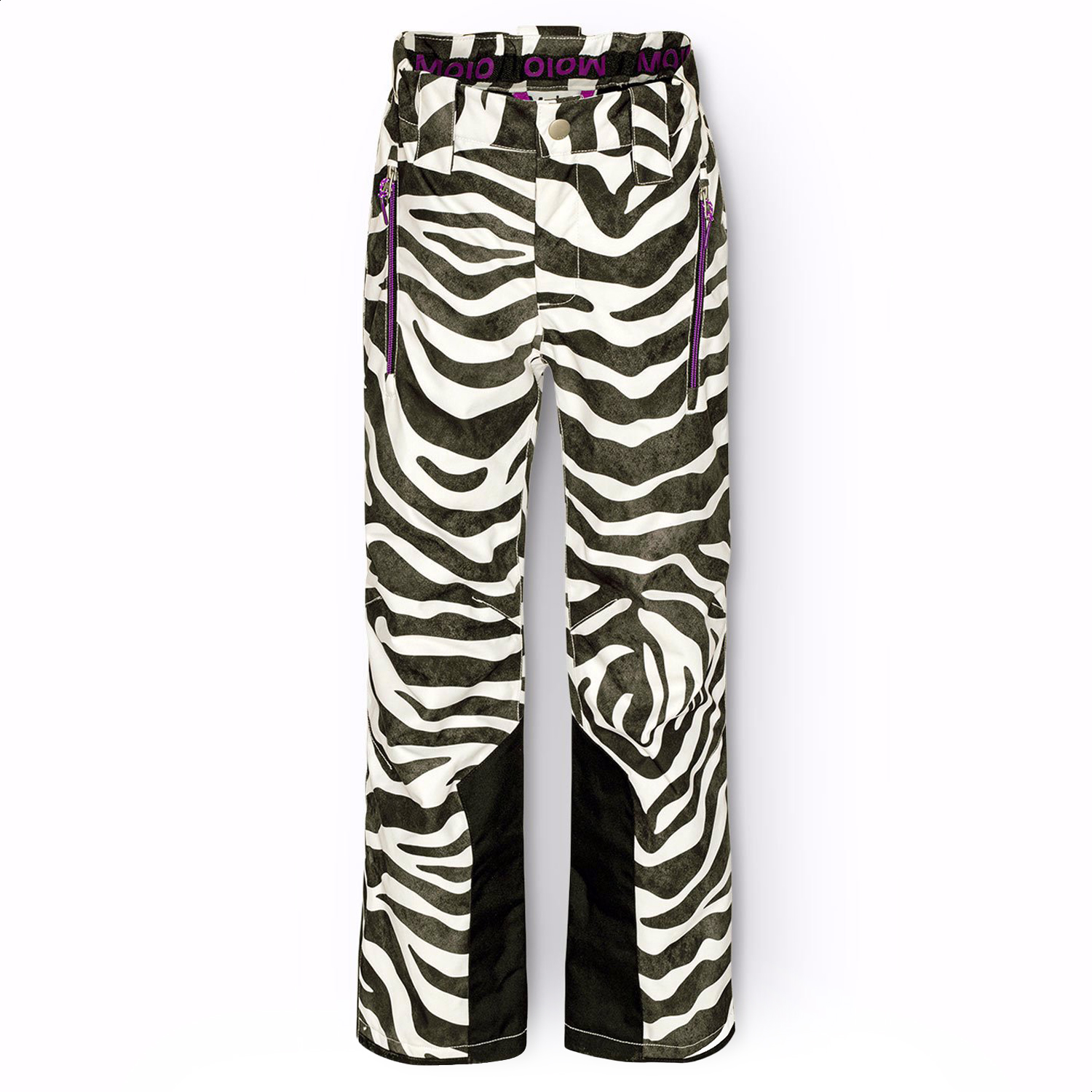Wind- en waterdichte skibroek van gerecycled polyester met zwart en witte zebrastrepen De skibroek heeft een knoop- en ritssluiting, een verstelbare elastiek aan de binnenkant, riemlussen voor Molos bretels (extra accessoire), en een verstelbare beenopening met sneeuwvangers en extra versteviging tussen de benen. De broek heeft zakken en een grote reflector aan de achterkant om de zichtbaarheid in het verkeer te vergroten. Daarnaast is de broek gevoerd met fleece op de blootgestelde gebieden en gevoerd met 3M™ Thinsulate™ voor meer bewegingsvrijheid voor je kind.