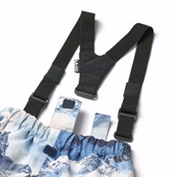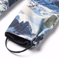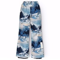 Wind- en waterdichte donkergroene gemaakt van gerecycled polyester met een print van een winterlandschap in verschillende tinten blauw. De skibroek heeft een elastische tailleband en een verstelbare elastiek aan de binnenkant, riemlussen voor Molos bretels (extra accessoire), en beenopeningen met sneeuwvangers. Er is ook een grote reflector op de achterkant om de zichtbaarheid in het verkeer te vergroten.