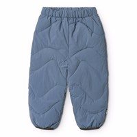 Waterafstotende donkerblauwe thermobroek voor de kleintjes met bruine boorden. De broek heeft een ruimvallende pasvorm, een elastische taille met een verstelbare elastiek en aansluitende uiteinde van de pijpen. De broek is gemaakt van gerecycled polyester met een waterafstotend oppervlak dat vrij is van PFOS en PFOA. Combineer dit met een bijpassende jas voor een warme en zachte thermoset.