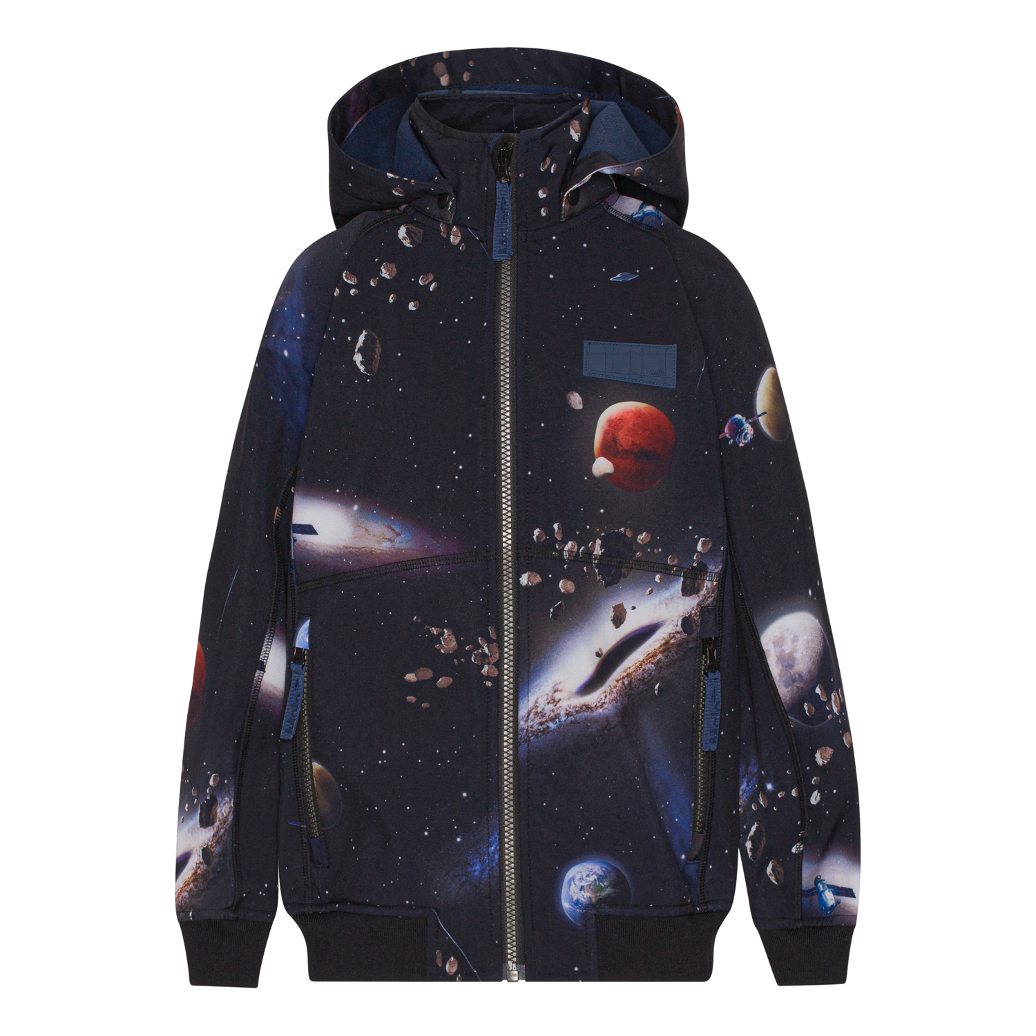 Donkere softshelljas met een allover print van planeten, verre sterrenstelsels en satellieten. De jas is gemaakt van een winddicht en waterafstotend materiaal met een waterkolomdruk tot 5.000 mm, dat bestand is tegen plotselinge regenbuien, en heeft goede luchtstroom om vocht op afstand te houden met een ademend vermogen tot 5.000 g/m2/24u. De jas heeft een afneembare capuchon en elastische taille, opstaande kraag en rits met kinbeschermer om wrijving tegen de huid tegen te gaan. Zakken aan de zijkanten, windvangers in de mouwen en elastische randen aan de onderkant en onderaan de mouwen. Er is een water- en vuilafstotende coating gebruikt zonder het gebruik van chemicaliën zoals PFOS, PFOA en dergelijke.