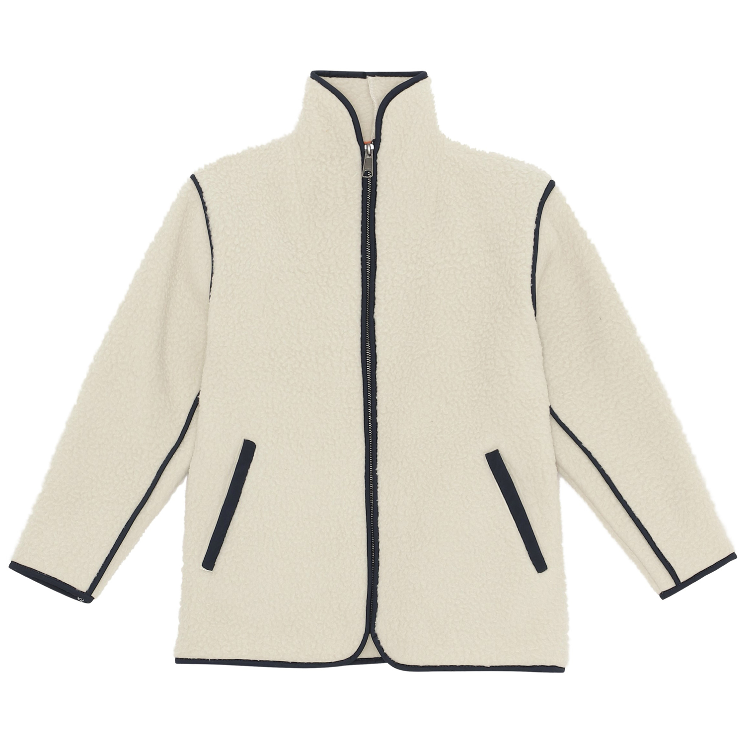 Halina is Molo's nieuwe fleece jas in het wit. De jas heeft een ritssluiting en een donkere boord.