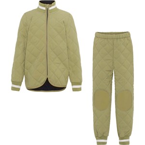 Hatton is een licht geïsoleerde thermoset in mosgroen met een contrasterende binnenkleur in donkerblauw. De jas heeft ribboord rond de hals en mouwen en heeft Molo's iconische sterreflector op de achterkant zodat het kind in het donker beter zichtbaar is. De broek heeft elastiek in de taille, ribboord rond de enkels en een reflecterende ster op de achterkant van één been. De broek heeft ook bijpassende verstevigingen bij de knieën en het zitvlak, waardoor het extra duurzaam zijn voor alle soorten spel en activiteiten.