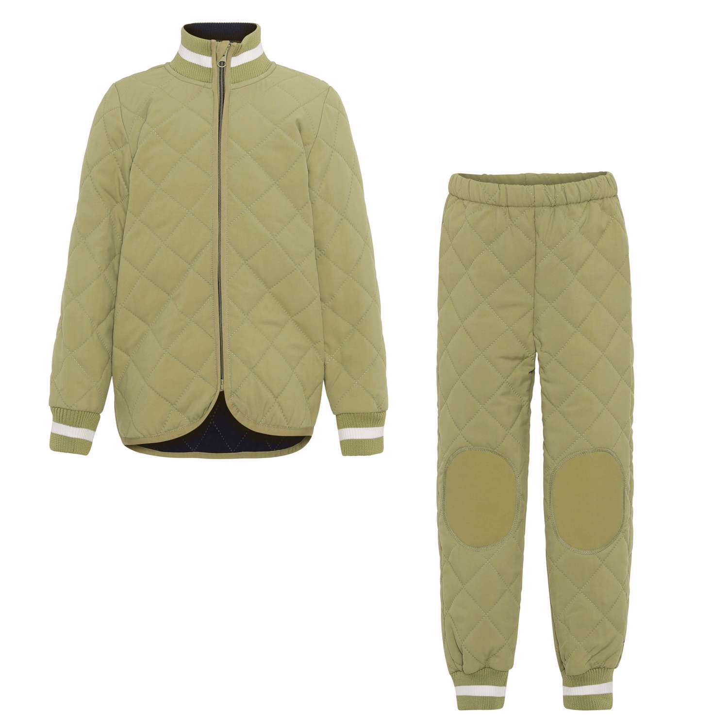 Hatton is een licht geïsoleerde thermoset in mosgroen met een contrasterende binnenkleur in donkerblauw. De jas heeft ribboord rond de hals en mouwen en heeft Molo's iconische sterreflector op de achterkant zodat het kind in het donker beter zichtbaar is. De broek heeft elastiek in de taille, ribboord rond de enkels en een reflecterende ster op de achterkant van één been. De broek heeft ook bijpassende verstevigingen bij de knieën en het zitvlak, waardoor het extra duurzaam zijn voor alle soorten spel en activiteiten.