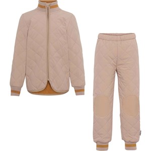 Hatton is een licht geïsoleerde thermoset in taupe met een contrasterende binnenkleur in goudgeel. De jas heeft ribboord rond de hals en mouwen en heeft Molo's iconische sterreflector op de achterkant zodat het kind in het donker beter zichtbaar is. De broek heeft elastiek in de taille, ribboord rond de enkels en een reflecterende ster op de achterkant van één been. De broek heeft ook bijpassende verstevigingen bij de knieën en het zitvlak, waardoor het extra duurzaam zijn voor alle soorten spel en activiteiten.