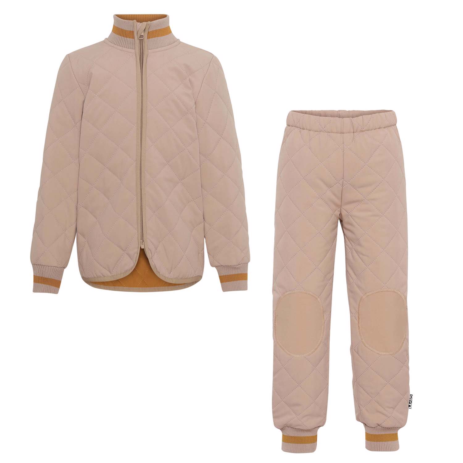 Hatton is een licht geïsoleerde thermoset in taupe met een contrasterende binnenkleur in goudgeel. De jas heeft ribboord rond de hals en mouwen en heeft Molo's iconische sterreflector op de achterkant zodat het kind in het donker beter zichtbaar is. De broek heeft elastiek in de taille, ribboord rond de enkels en een reflecterende ster op de achterkant van één been. De broek heeft ook bijpassende verstevigingen bij de knieën en het zitvlak, waardoor het extra duurzaam zijn voor alle soorten spel en activiteiten.
