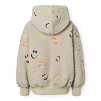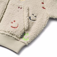 Beige fleecejas gemaakt van gerecycled polyester met geborduurde kleurrijke lachende gezichten. De jas is oversized, heeft een ritssluiting, bijpassende ribboorden en voorzakken. De jas heeft een zachte en gladde katoenen voering, waardoor het comfortabel is om te dragen.