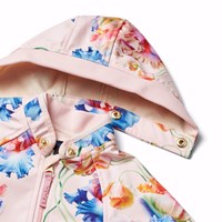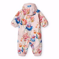 Roze wind- en waterafstotende softshellpak voor de kleintjes van gerecycled polyester met een kleurrijke print van artistieke tulpen. Het pak heeft een interne fleecevoering, een stervormige reflector op één been, een afneembare capuchon en nauwsluitende beige ribboorden rond de mouwen, pijpen en kraag om de wind buiten te houden. De praktische diagonale ritssluiting heeft een kinbescherming en loopt door tot aan één pijp, waardoor het aan- en uittrekken gemakkelijk gaat.