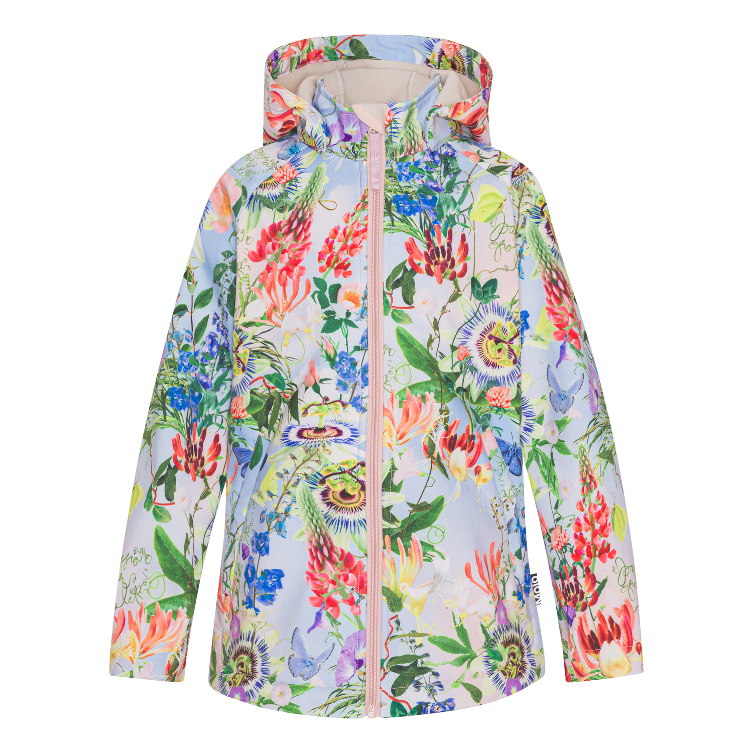 Hillary is een functionele lichtblauwe softshell jas met een bloemenprint. De jas heeft een praktische lengte met elastiek aan de achterkant, waardoor het een geweldige pasvorm heeft. Het heeft een afneembare capuchon, een ritssluiting en zakken aan de voorkant, ribboord aan de mouwen en een reflector op de achterkant. Molo's softshell jassen zijn perfect voor overgangsweer, omdat de stof ademend en water-en winddicht is. Dit product heeft een waterbestendige, PFC-vrije oppervlaktebehandeling (Bevat bijvoorbeeld geen PFOS, PFOA, etc). Waterkolomdruk: 8.000 mm. Ademend: 5.000 g/m2/24u. De naden zijn niet getapet.