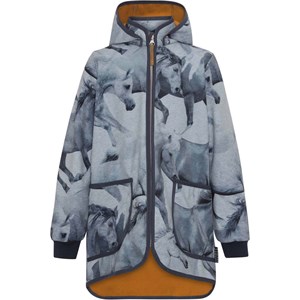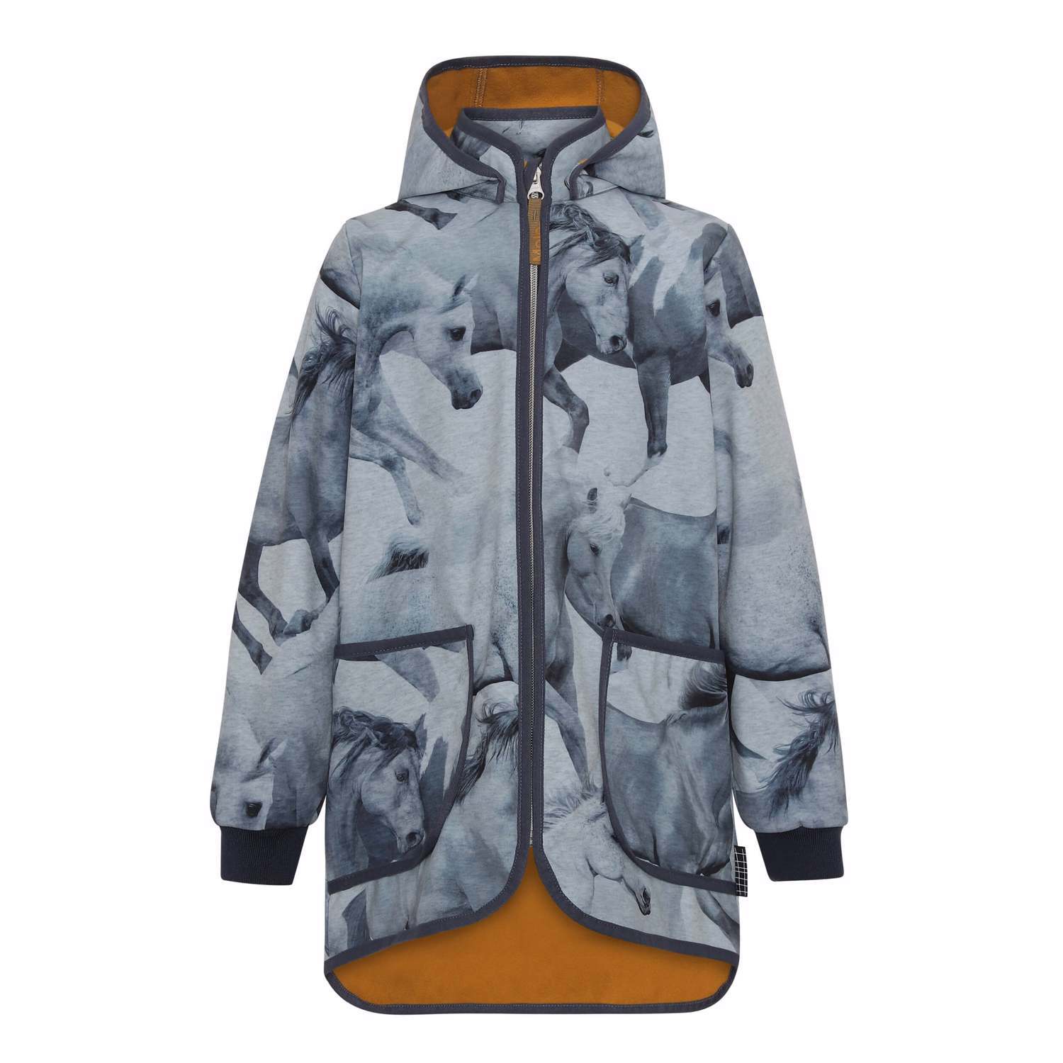Hillary is een functionele softshell jas met een print van galopperende paarden en een mooie contrastkleur aan de binnenkant. De jas heeft een praktische lengte met elastiek aan de achterkant voor een goede pasvorm. Het heeft een afneembare capuchon, een ritssluiting aan de voorkant, zakken aan de voorkant, ribbe aan de mouwen en een reflector op de achterkant. Molo's softshell jassen zijn perfect voor overgangsweer omdat de stof waterdicht, winddicht en ademend is. De jas heeft een comfortabele fleece aan de binnenkant die is gemaakt van gerecyclede plastic flessen. Dit product heeft een waterbestendige, PFC-vrije oppervlaktebehandeling (bevat bijvoorbeeld geen PF OS, PFOA, enz.). Waterkolomdruk: 8.000 mm. ademend: 5.000 g/m2/24u. Het heeft geen getapete naden.