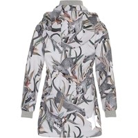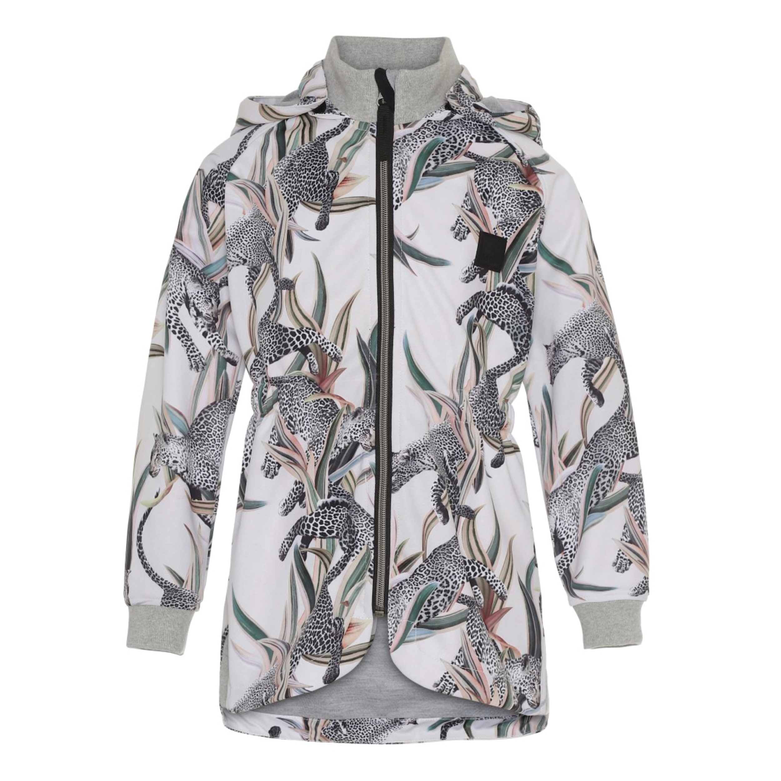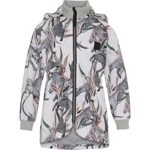 Hillary is een parka geïnspireerde softshell jas in wit met een luipaardprint. De jas heeft een elastische taille, afneembare capuchon, een ritssluiting aan de voorkant en een elastische boord aan de mouwen. Het heeft Molo's iconische sterreflector aan de achterkant. Molo's softshell jas is perfect voor overgangsweer omdat de stof waterdicht, winddicht en ademend is. Dit product heeft een waterbestendige, PFC-vrije oppervlaktebehandeling (bevat geen bijv. PF OS, PFOA, enz.). Waterkolom druk: 8.000 mm. ademend: 3.000 g / m2 / 24 uur.