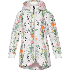 Hillary is een op een parka geïnspireerd softshell jas in het wit met een print van verticale bloemenkettingen. De jas heeft een elastische tailleband, afneembare capuchon, een ritssluiting aan de voorkant en een elastische boord bij de mouwen. Het heeft Molo's iconische sterreflector op de achterkant. De softshell jassen van Molo zijn perfect voor wisselend weer omdat de stof waterdicht, winddicht en ademend is. Dit product heeft een waterbestendige, PFC-vrije oppervlaktebehandeling (bevat bijvoorbeeld geen PF OS, PFOA, enz.). Waterkolomdruk: 8.000 mm. ademend: 3.000 g / m2 / 24 uur