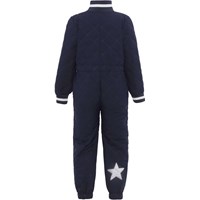 Hollyn is een donkerblauw praktisch en licht geïsoleerd thermopak met een mosgroene contrastkleur aan de binnenkant. Het is perfect voor kleine kinderen. Het heeft ribboord rond de hals en mouwen, steekzakken en verstelbaar elastiek aan de achterkant. Het pak heeft Molo's iconische sterreflector op de achterkant van een been, maar niet op maat 134/140. Maten 74/80 t/m 98/104 hebben verstevigingen op de knieën in dezelfde kleur als het pak, niet te zien op de foto.
