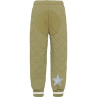 Hoti is een licht geïsoleerde thermobroek in mosgroen met een contrasterende binnenkleur in donkerblauw. De broek heeft elastiek rond de taille, ribboord rond de enkels en Molo's iconische reflector op de achterkant van een pijp zodat het kind in het donker beter zichtbaar is. De broek heeft ook bijpassende verstevigingen op de knieën en het zitvlak, wat de broek duurzaam maakt voor allerlei activiteiten en spel.